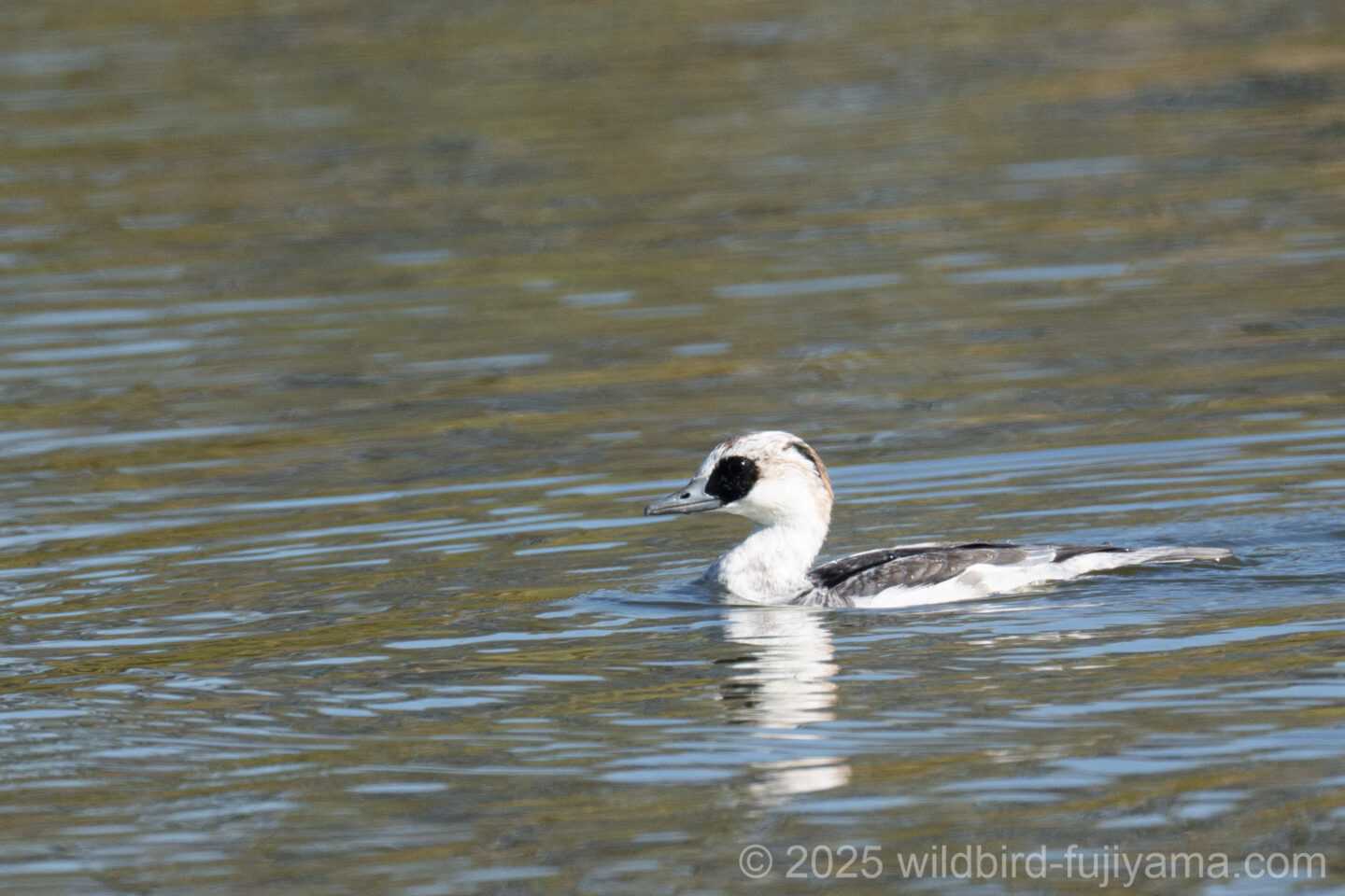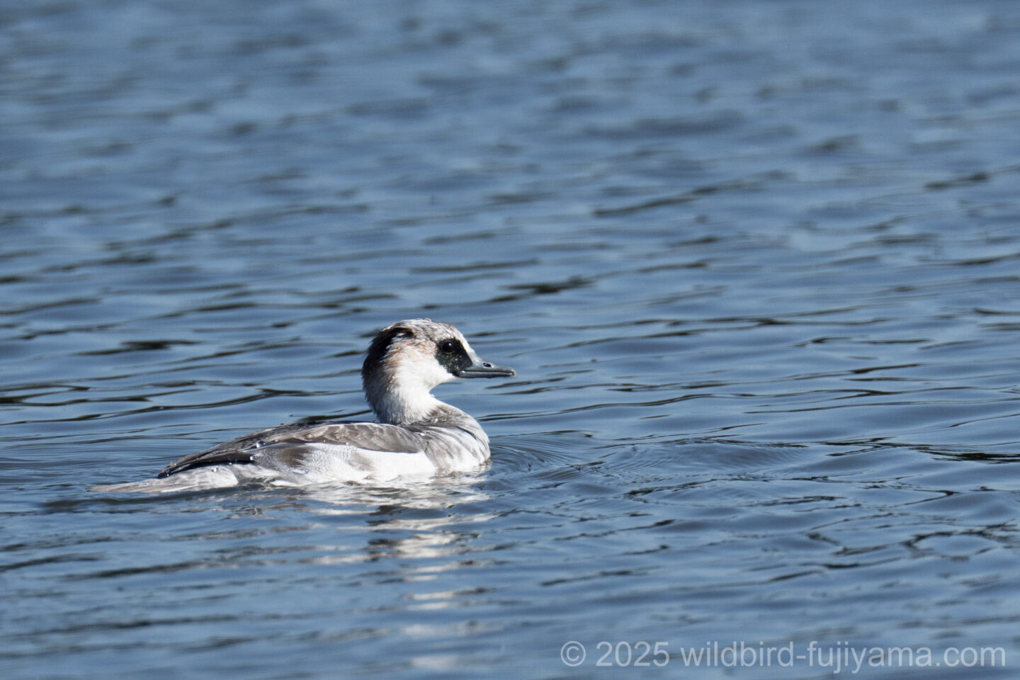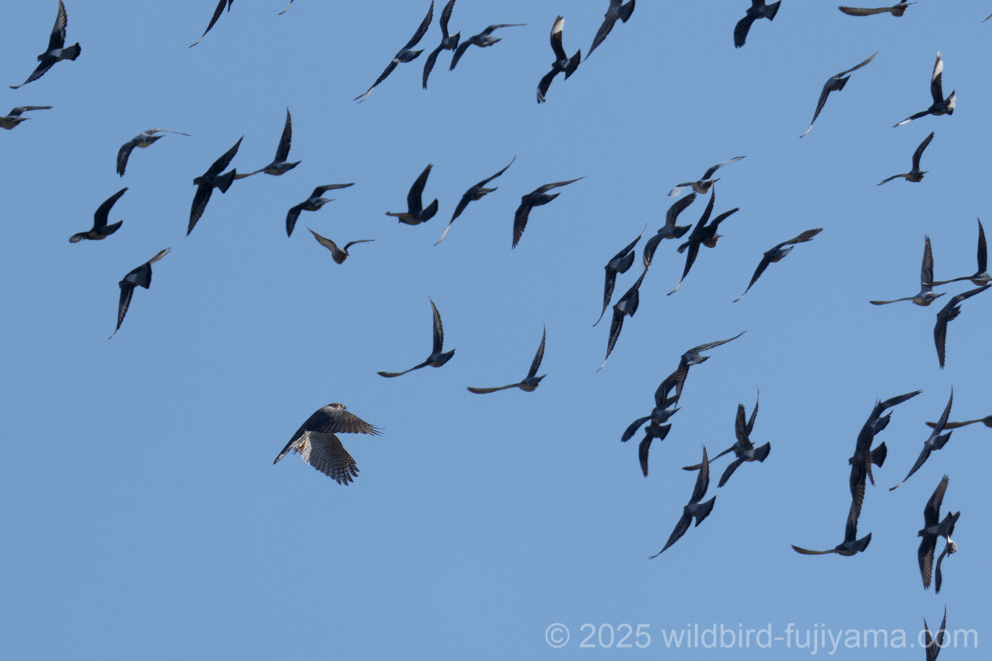 こんにちは。バードふじやまです。今朝は濃霧の中を車で出動しました。現場は更に酷い濃霧で9時近くまで晴れなかった上に見事な空振りでした。このまま帰るのもあれなのでダメ元で立ち寄ったフィールドにミコアイサ♂エクリプス1羽と♀4羽がいました。また、オオタカとハトの群れの絡みも撮れたので最悪の坊主は免れました(笑)。