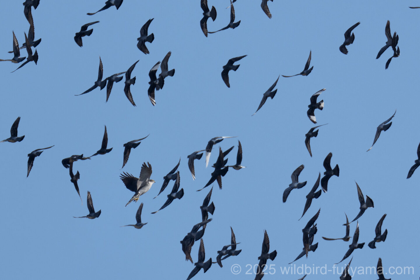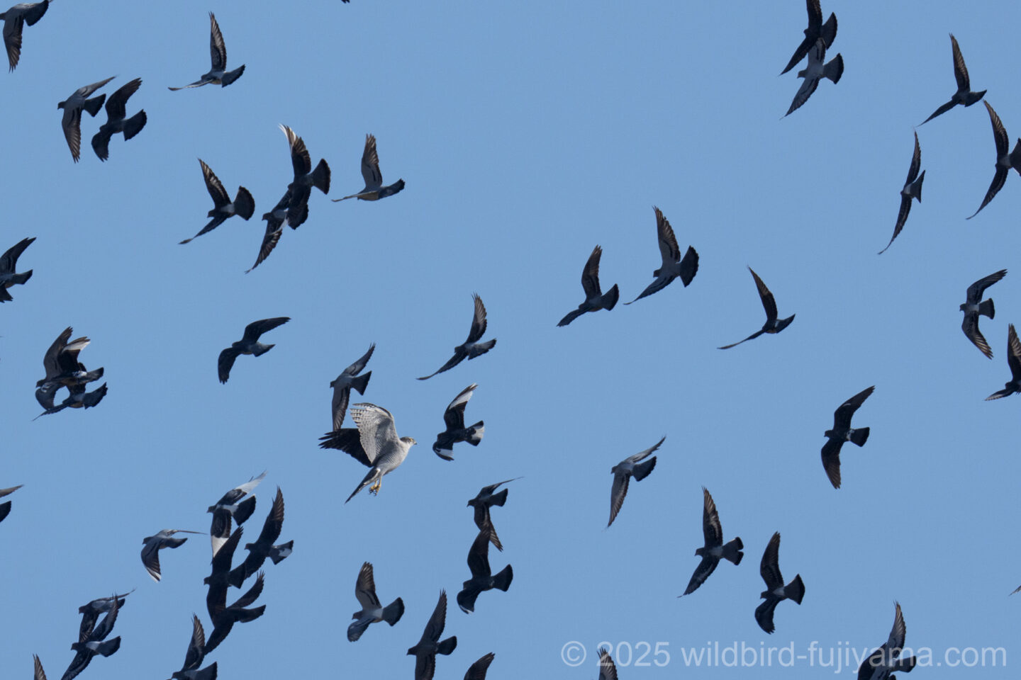100羽ぐらいのハトの群れが舞っていて、良く見るとオオタカが狩りをする訳でもなく群れに何度か絡んでました。ハトも分かっていて逃げる事もなくやり過ごしてましたね。