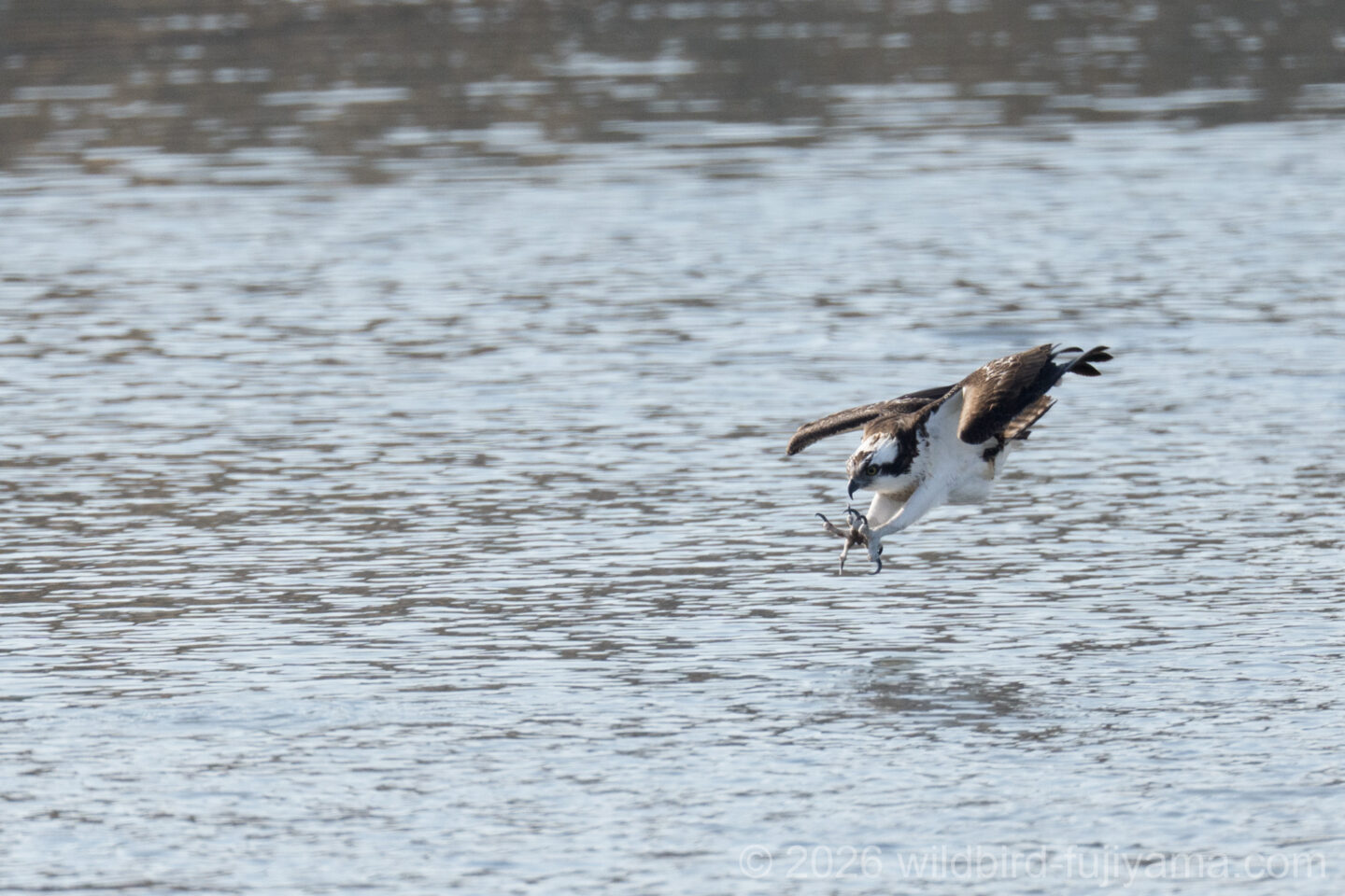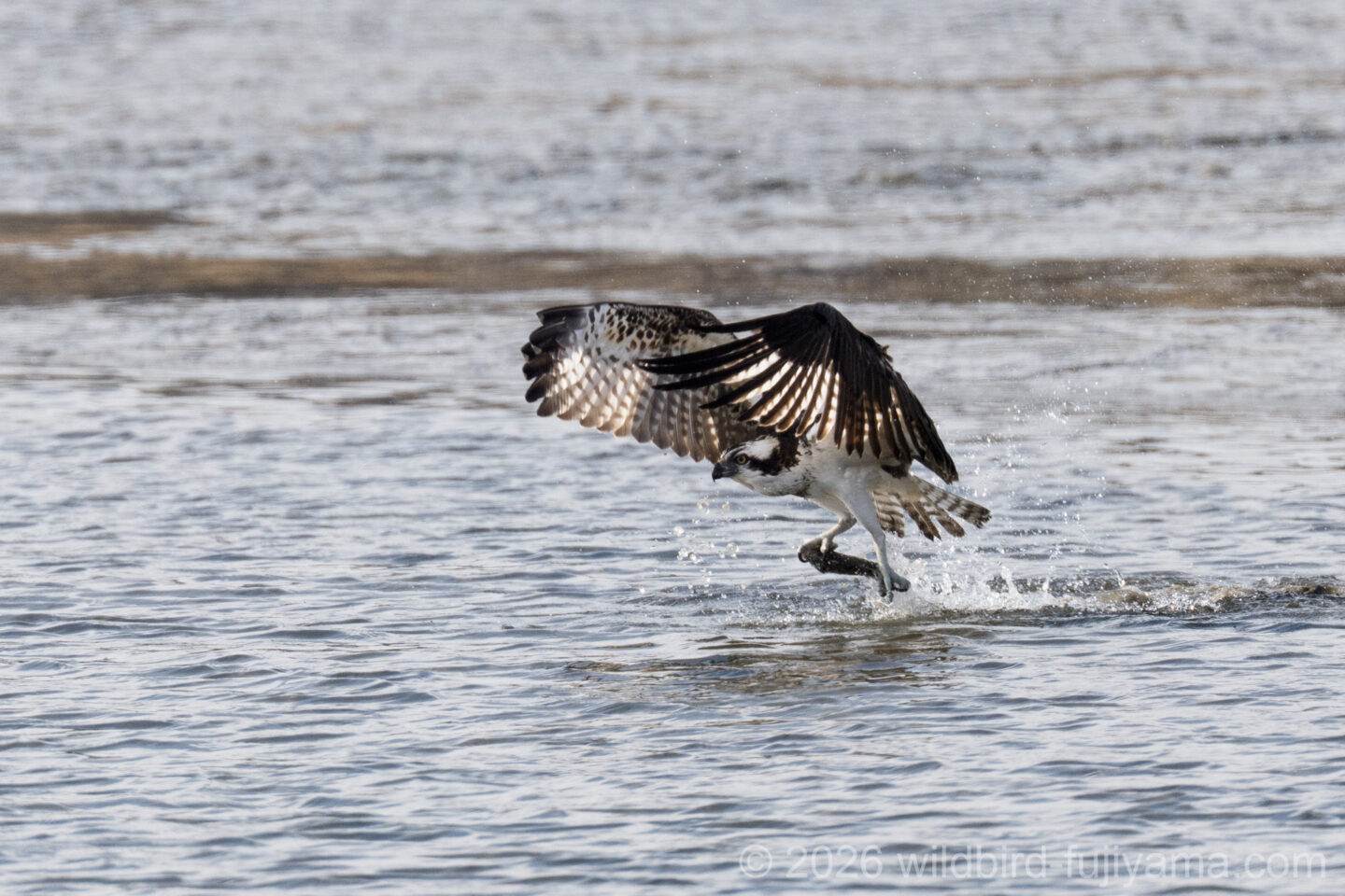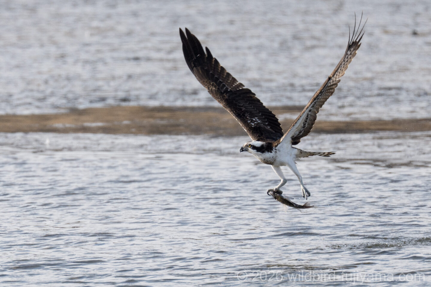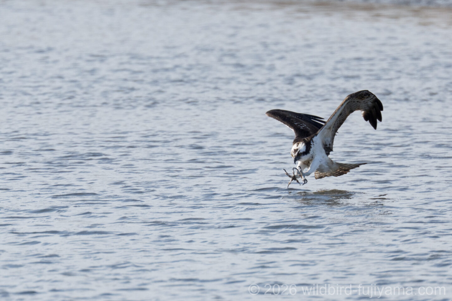 後からやってきて鮮やかに1発で仕留め飛び去るミサゴ。翼を広げたままの低速で体を水につけることもなく大物を仕留めるなんともクールなハンター。痺れます(笑)。