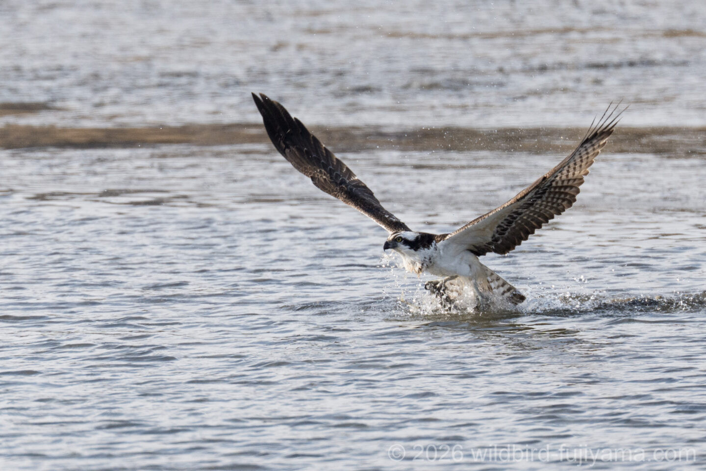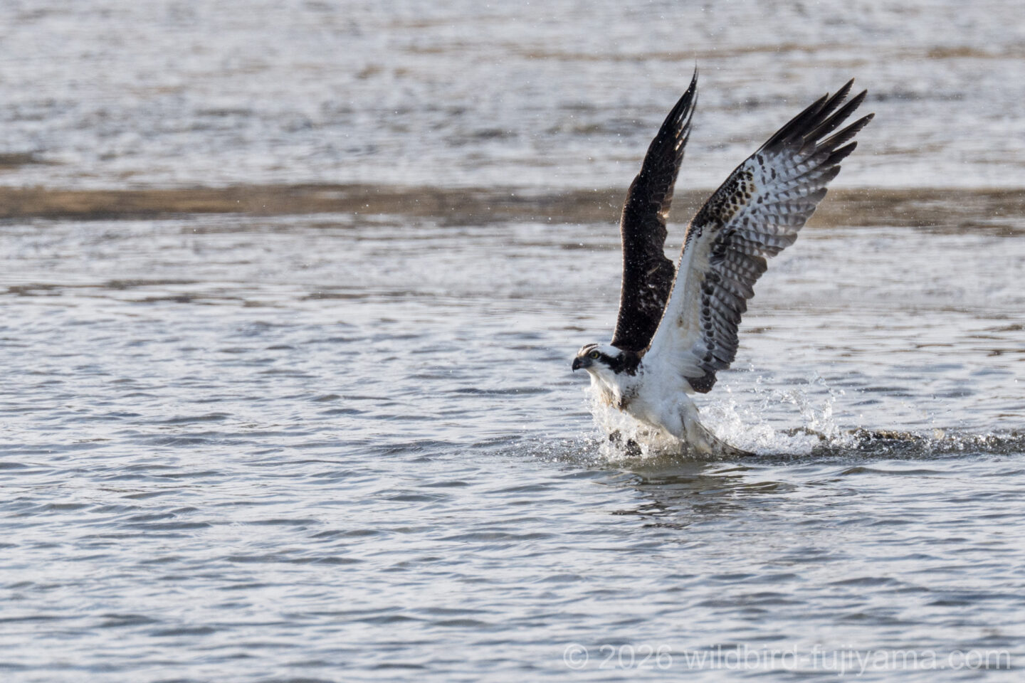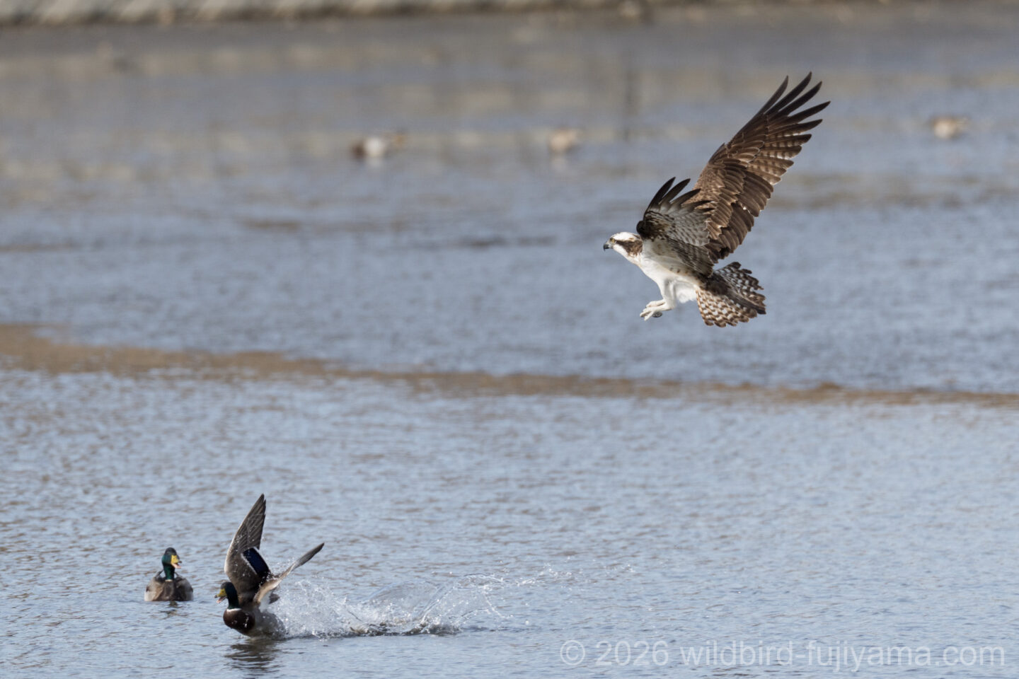 後からやってきて鮮やかに1発で仕留め飛び去るミサゴ。翼を広げたままの低速で体を水につけることもなく大物を仕留めるなんともクールなハンター。痺れます(笑)。