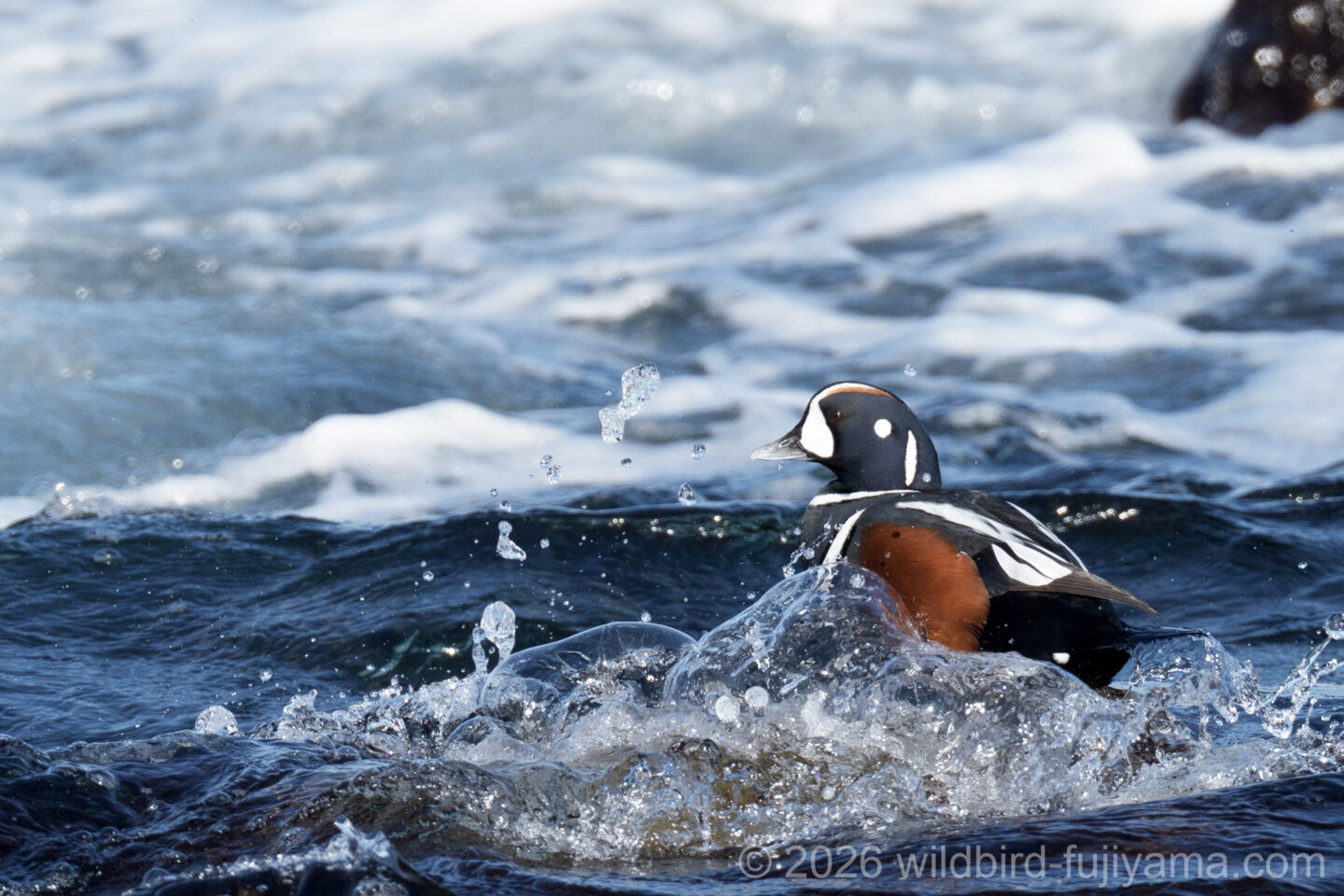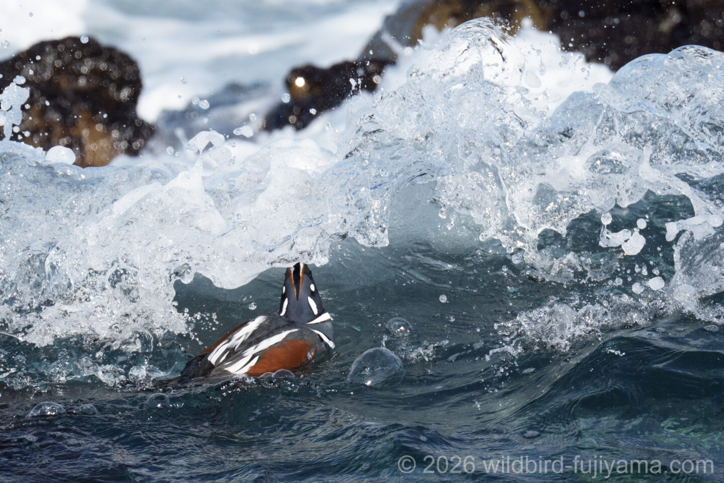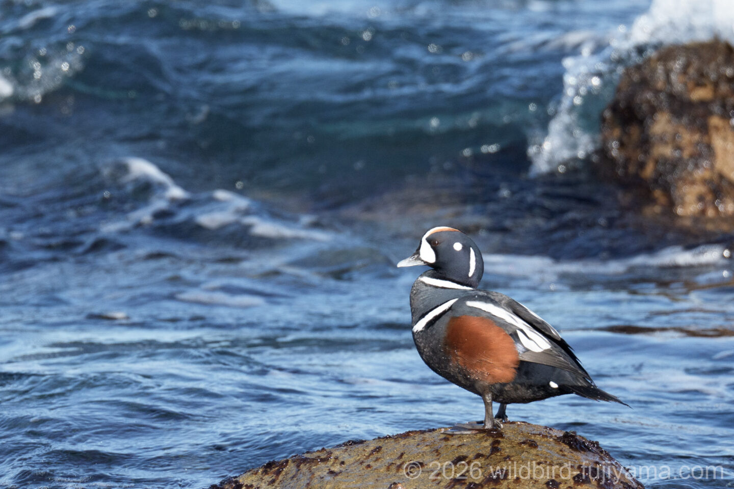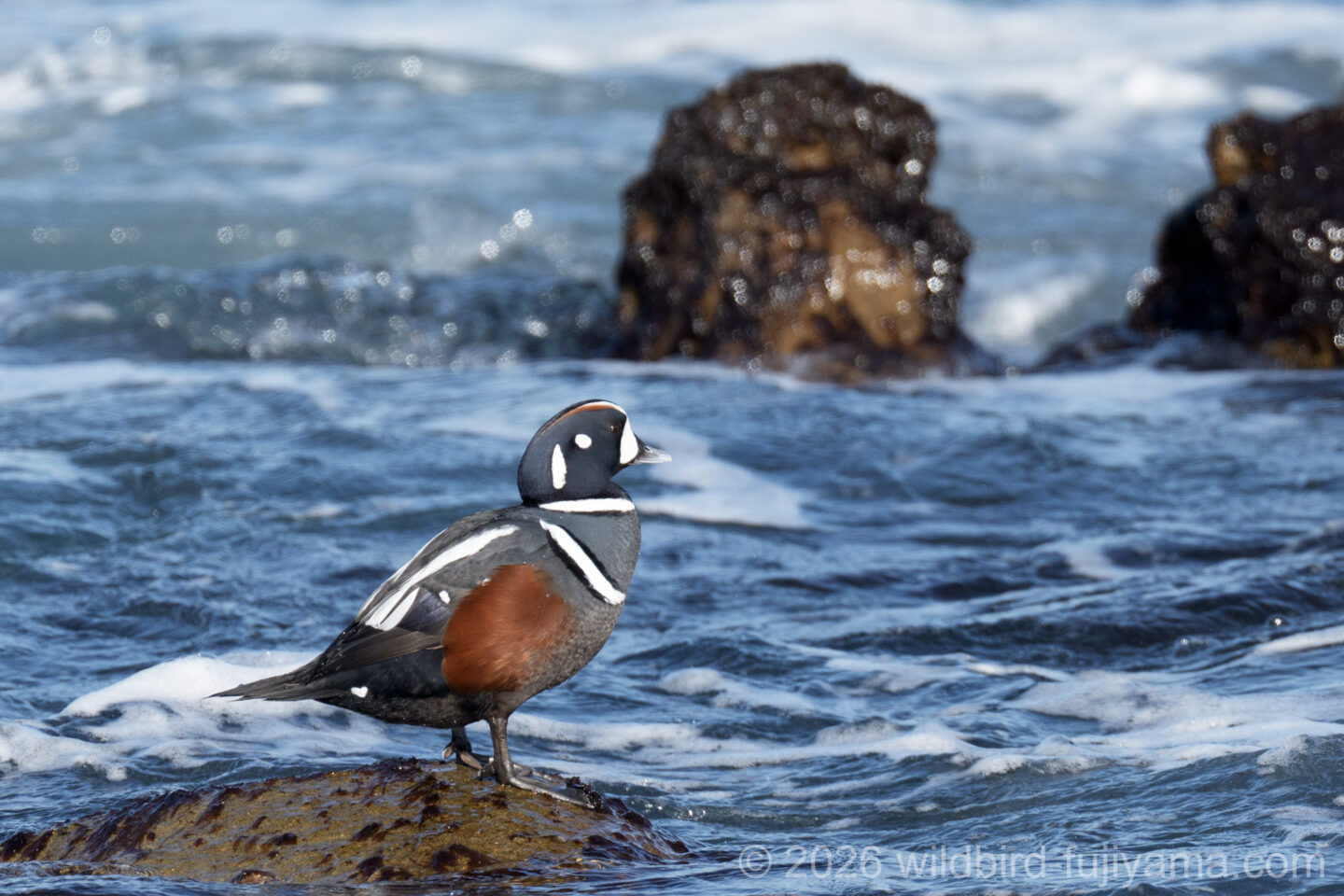 10分ぐらいですかね。岩場のお立ち台に乗ってくれたので全身が撮れました。4枚目で頭から波をかぶっても何事もなかった様に泳いでます。潜水ガモなので当たり前ですが・・・。